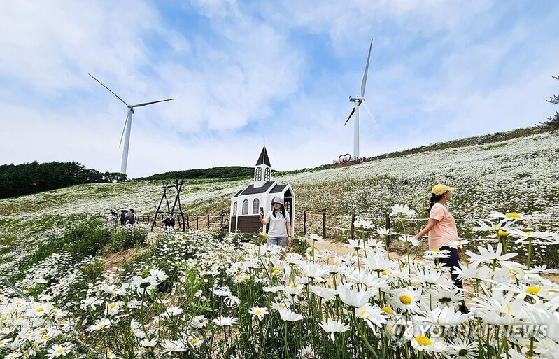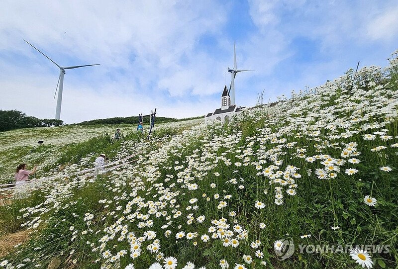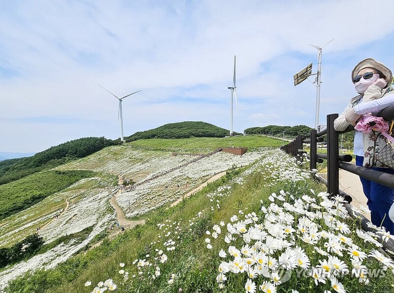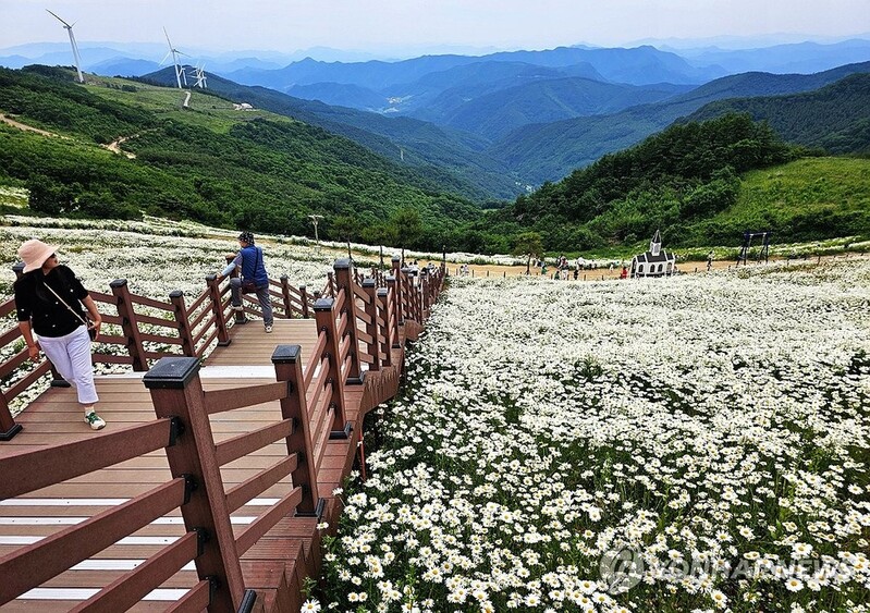 | ▲ 샤스타데이지 만개한 평창 청옥산 육백마지기 (평창=연합뉴스) 이재현 기자 = 20일 강원 평창군 청옥산 육백마지기에 샤스타데이지가 만개해 관광객들의 시선을 사로잡고 있다. 해발 1천250m의 청옥산 육백마지기는 평창군 미탄면과 정선군 정선읍에 걸쳐 있는 산이다. 육백마지기는 '볍씨 600말을 뿌릴 수 있는 넓은 들판'이라는 뜻이라고 전해져 내려온다. 2024.6.20 jlee@yna.co.kr |