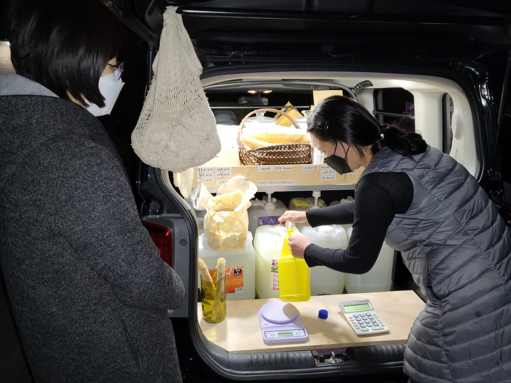 "딸이 유치원에서 장기 프로젝트로 다양한 환경 수업을 받았는데, 수업에서 배운 내용을 집에서도 자주 이야기했어요. 언젠가 제가 커피를 마시는 모습을 보고는 빨대를 가리키며 '거북이가 코피 나'라고 말하더라고요. 환경 문제에 무지했던 저는 도통 무슨 이야기인지 알 수가 없었죠. 딸 덕분에 틈틈이 관련된 내용을 찾아보고 쓰레기를 줄이는 '제로웨이스트' 활동을 알게 됐습니다. 그리고 국내에도 많은 제로웨이스트 상점이 운영된다는 사실을 알게 되었고 이용해 보고 싶었죠. 하지만 당시 집 근처에는 이런 상점이 없어 서울까지 가야 했어요. 그때 느꼈던 불편함이 집 앞으로 찾아가는 리필숍을 만든 계기가 되었습니다."