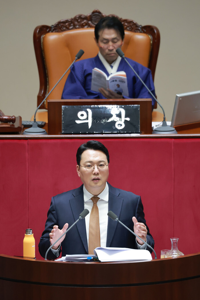 Chun Ha-ram (bottom), floor leader of the minor New Reform Party, speaks at a plenary session of the National Assembly in Seoul on Jan. 16, 2026, as he filibusters to prevent the passage of the ruling Democratic Party-led bill calling for a second round of special counsel probe into former President Yoon Suk Yeol's martial law imposition and allegations surrounding his wife. (Yonhap)