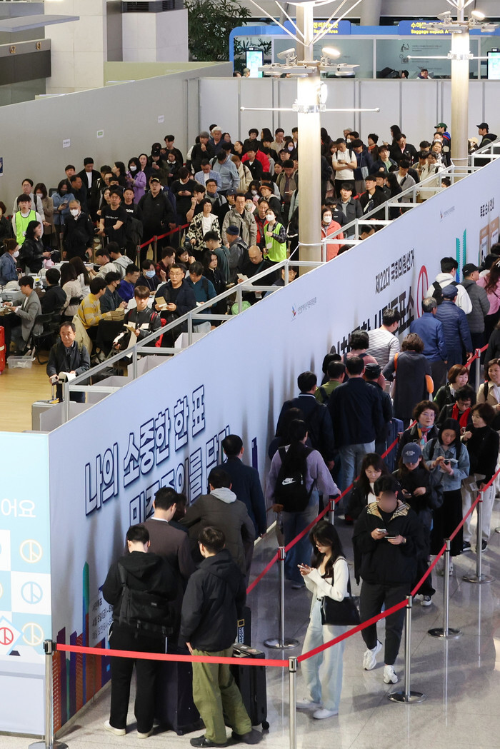 Outbound tourists stand in a long line to cast ballots before their departure at a polling station at Incheon International Airport, west of Seoul, on April 5, 2024, the first day of two-day early voting for the April 10 general elections. (Yonhap)