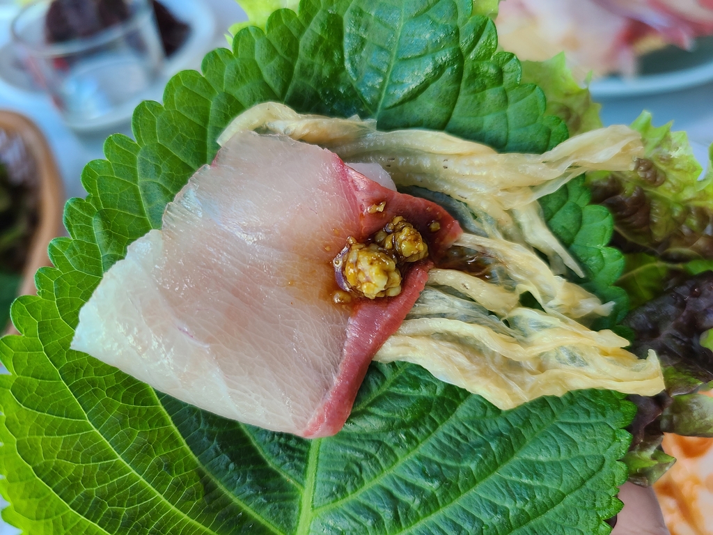 노릇하게 구워져 나온 대방어는 바삭한 식감과 고소한 맛으로 회와는 또 다른 별미를 선사했다.