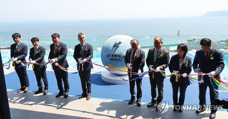 | ▲ L7 해운대 호텔 그랜드 오픈 (부산=연합뉴스) 손형주 기자 = 19일 오후 부산 해운대구 해운대해수욕장 인근에 위치한 L7해운대에서 열린 그랜드오픈 행사에서 김태홍 롯데호텔앤리조트 대표이사와 이정실 부산관광공사 사장 등이 호텔 오픈을 기념하는 세리머니를 하고 있다. 2024.6.19 handbrother@yna.co.kr |