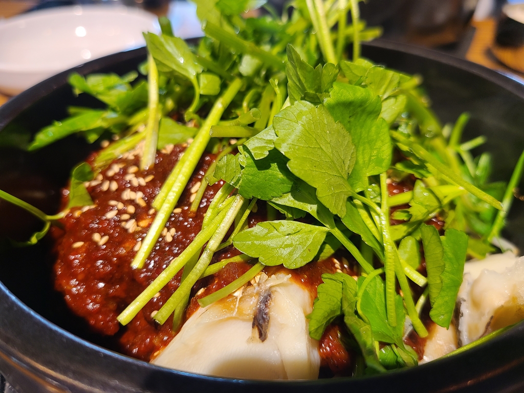 대구 아래에는 자작한 육수와 함께 콩나물이 깔려 있었고, 여기에도 쑥갓이 올려져 있었다.
