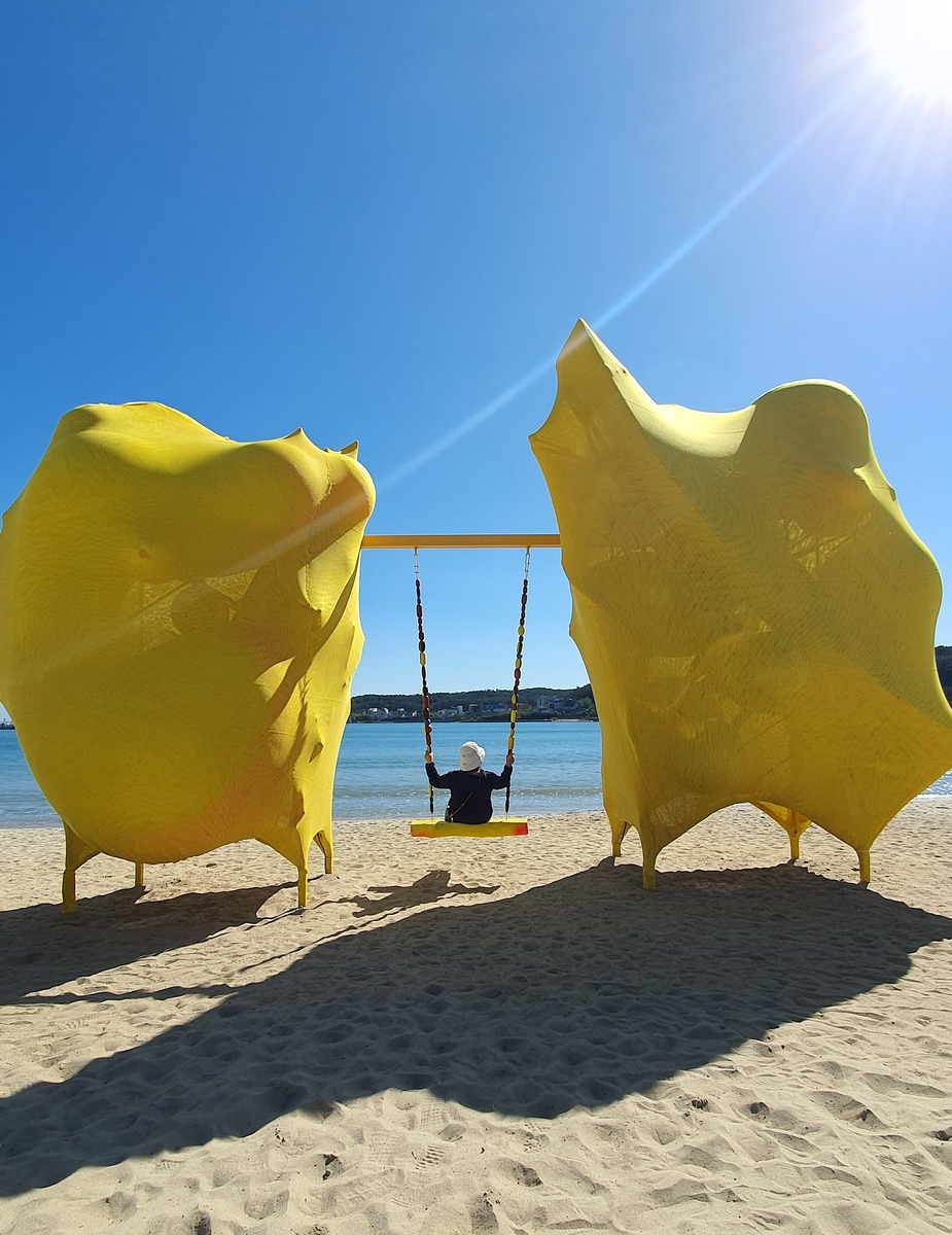 해수욕장 중앙으로 가면 이번 전시에서 최고 포토존으로 부상한 짙은 노랑 풍선 모양의 설치 작품을 마주한다.