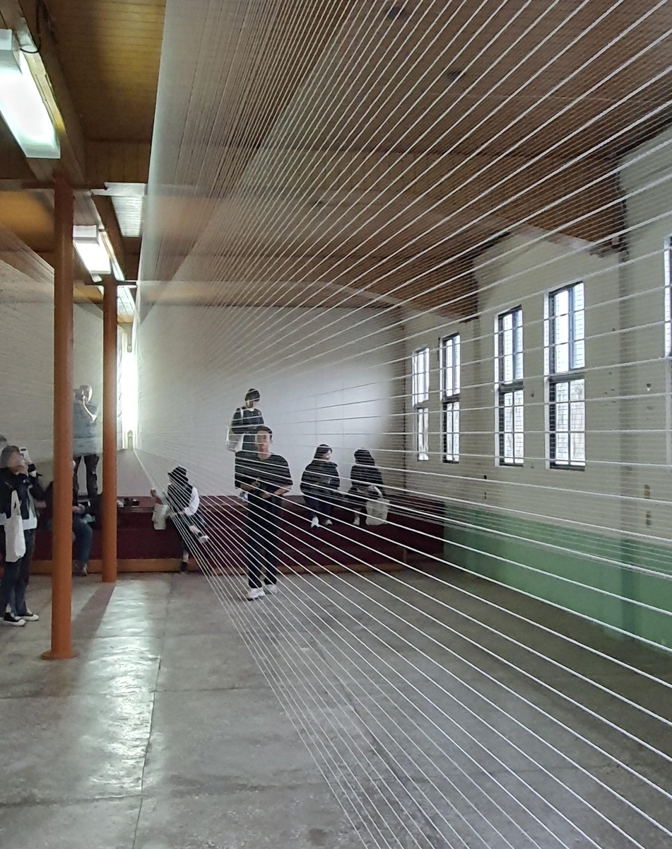 수많은 가닥으로 엮어낸 낚싯줄은 빛을 받아 광선처럼 공간을 자르고 줄은 내부에서 옆 건물 옥상으로 뻗어 나간다. 그 시선을 따라가면 바다로 이어진다.