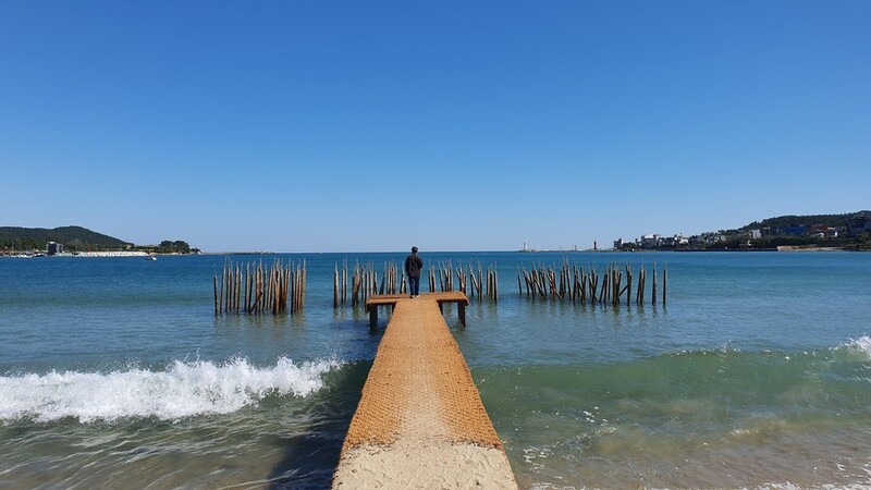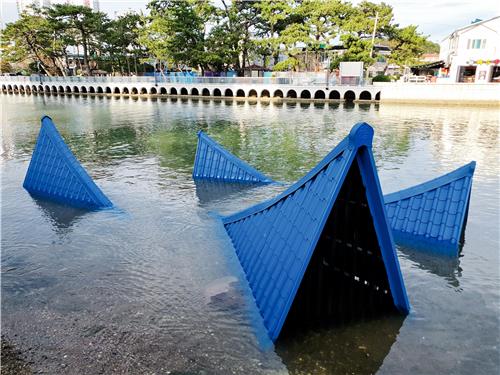 이곳에서 조금 더 해수욕장 쪽으로 내려가면 물에 잠긴 파란 기와지붕의 작품을 볼 수 있다.