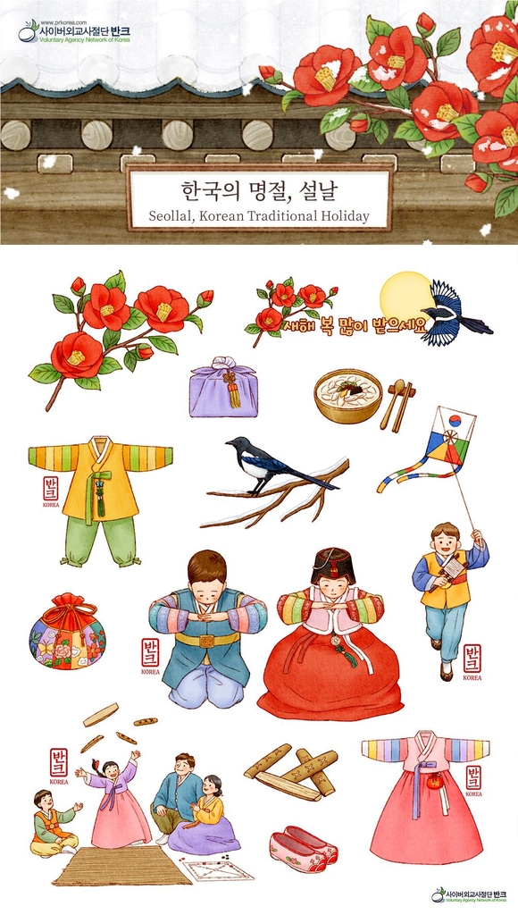 '새해 복 많이 받으세요'라는 한국어 인사말과 설빔을 입고 세배를 하는 남자아이와 여자아이, 설음식인 떡국, 연날리기와 윷놀이 모습을 담았다.