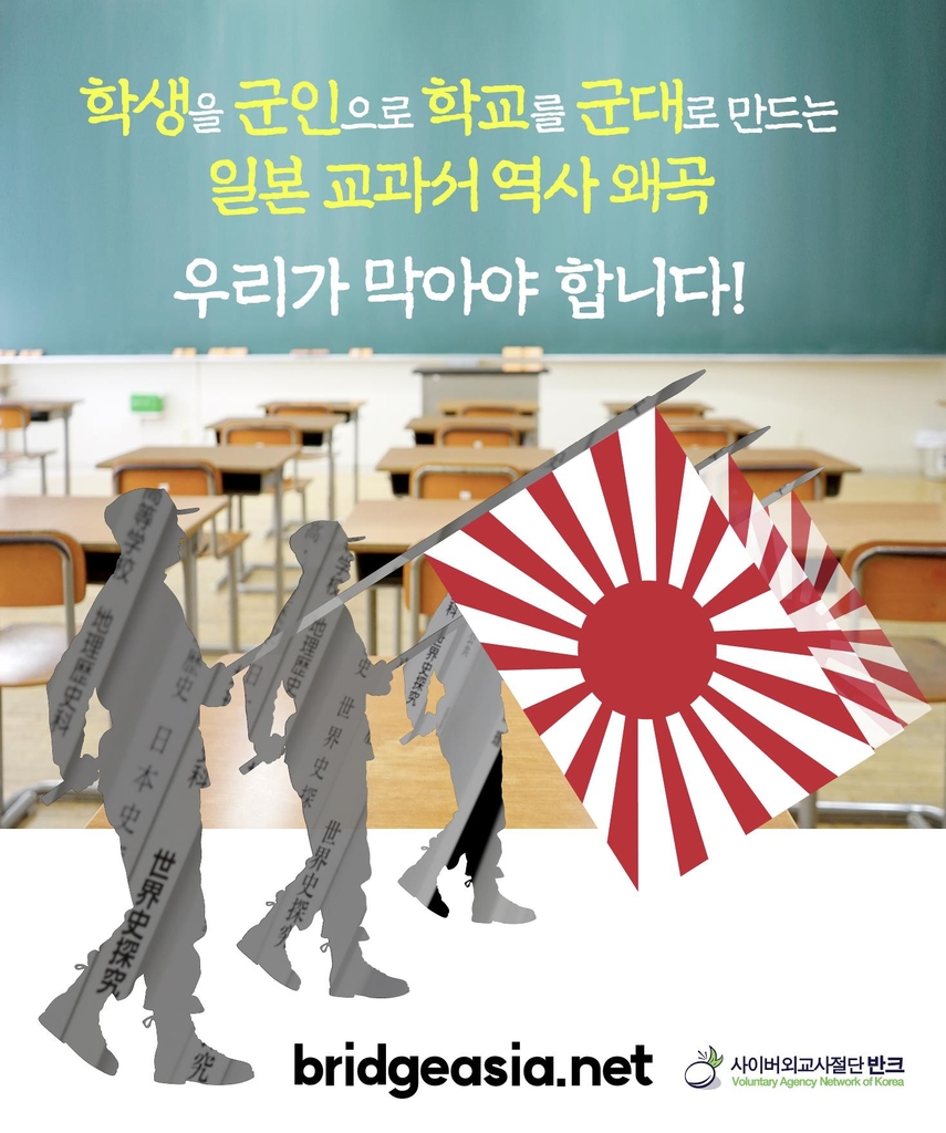 '학생을 군인으로, 학교를 군대로 만드는 일본 교과서 역사 왜곡, 우리가 막아야 합니다'라는 제목의 포스터에는 고등학교 교실을 배경으로 욱일기 깃발을 든 군인이 등장한다.