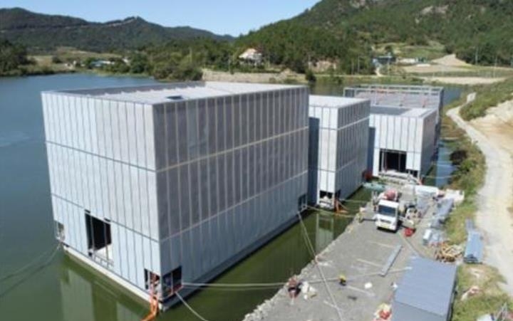 군은 23일 현재 전시실 등 건물 7동을 저수지에 진수하고 내·외장 작업을 하고 있다.