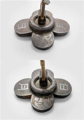 4개의 꽃잎 형태로 만들어진 받침은 용, 항해 중인 선박, '일'(日)·'월'(月) 글자가 상감 기법으로 새겨져 있다. 표면에 무늬를 파고 그 속을 은(銀) 등으로 채우는 방식이다.