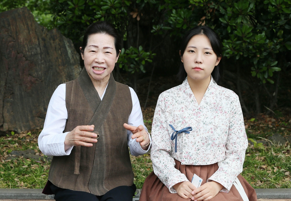 | ▲ 제주농요 전통 잇는 할머니와 손녀 (제주=연합뉴스) 변지철 기자 = 지난 11일 제주민속자연사박물관 앞마당에서 열린 제3회 제주 일노래 상설공연에 앞서 제주도무형문화재 제16호 제주농요 2대 보유자인 김향옥(70) 씨와 그의 외손녀 김나연(20) 씨가 연합뉴스와 인터뷰하며 환하게 웃고 있다. 2022.6.29 |