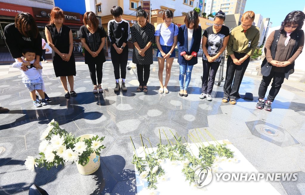 | ▲ 중국인에 살해당한 제주도민의 명복을 빕니다 (제주=연합뉴스) 지난 2016년 9월 20일 중국인 관광객들이 많이 찾는 제주시 연동 바오젠거리에서 제주한라대학교 유학생회가 제주의 한 성당에서 중국인이 휘두른 흉기에 찔려 숨진 제주도민을 추모하는 자리를 마련한 가운데 제주글로벌센터의 다문화가정 여성과 유학생 등이 묵념하고 있다. [연합뉴스 자료사진] |
