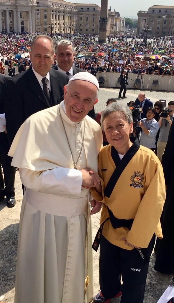 | ▲ 2018년 바티칸에서 세계태권도연맹(WT) 시범단과 함께 시범을 보인 뒤 프란치스코 교황과 만난 린다 심 수녀. [린다 심 수녀 제공. 재판매 및 DB 금지] |