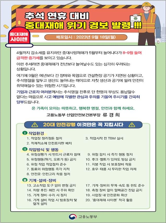 최근 3년(2020∼2022년) 동안 추석 전후 10일간 건설·제조·물류업 상시 근로자 50인 미만 사업장에서 발생한 중대재해가 다른 기간보다 20% 많은 것으로 나타난 데 따른 조치다.