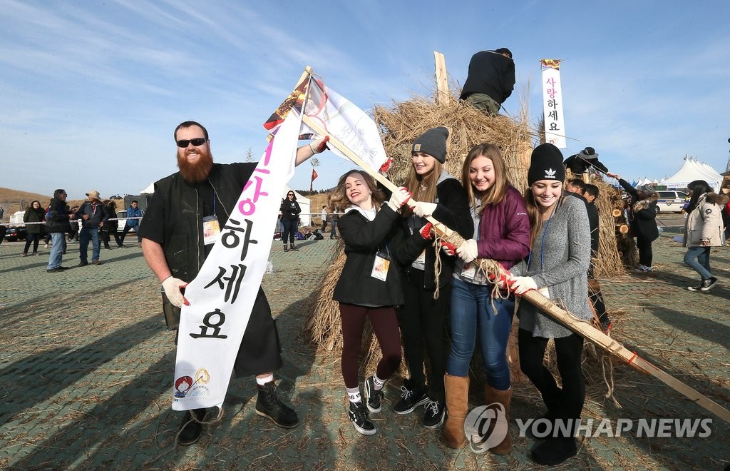 | ▲ "건강하세요!" (제주=연합뉴스) 2017 제주들불축제에 참여한 외국인들의 달집 만들기 경연 모습. [연합뉴스 자료사진] |