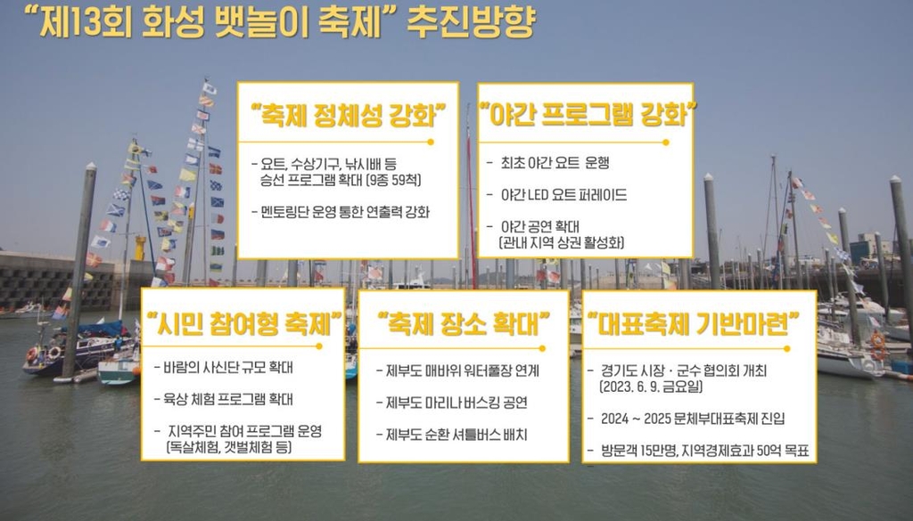 (화성=연합뉴스) 최해민 기자 = 수도권 최대 해양축제인 제13회 '화성 뱃놀이 축제'가 내달 9일부터 11일까지 3일간 경기 화성시 서신면 전곡항과 제부도 일대에서 열린다.