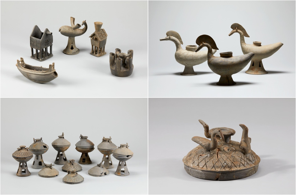 | ▲ 주요 전시품 왼쪽 상단부터 시계 방향으로 함안 말이산 45호 무덤 상형 토기, 새모양 토기, 쪽샘 B지구 6호 무덤 토우 장식 토기, 경주 황남동 출토 토우 장식 토기 [국립중앙박물관 제공. 재판매 및 DB 금지] |