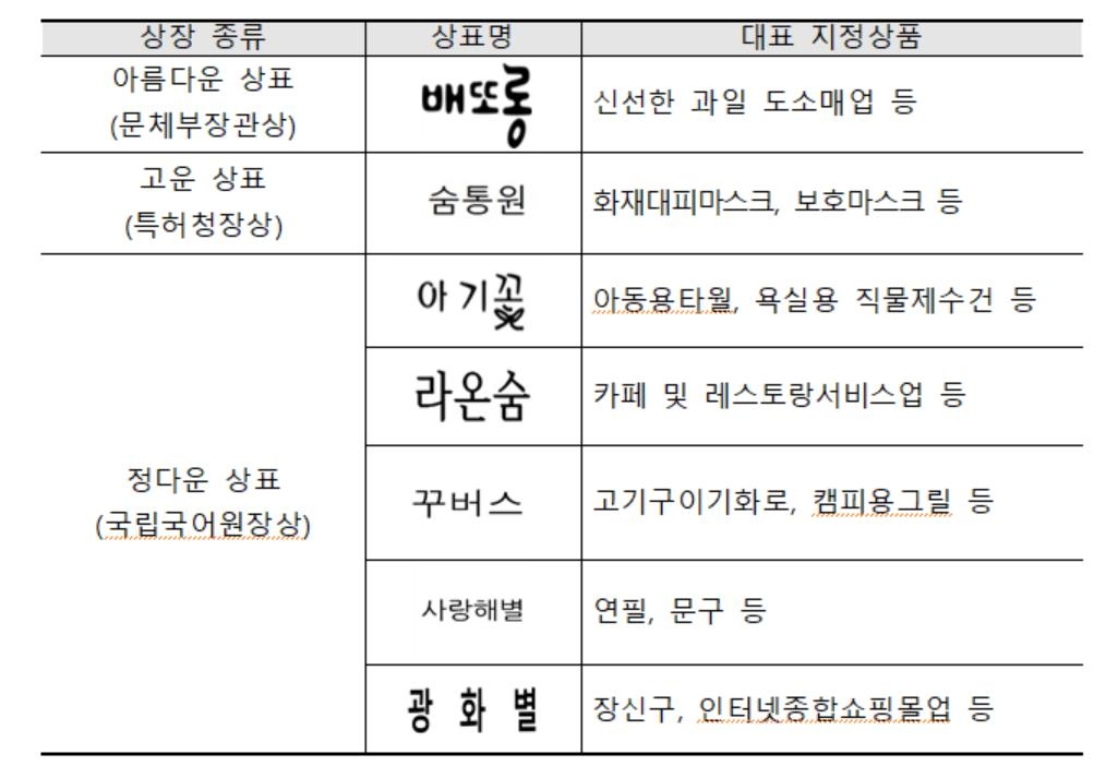 정다운 상표(국립국어원장상)에는 '아기꽃', '라온숨', '꾸버스', '사랑해별', '광화별' 등 5건이 선정됐다.