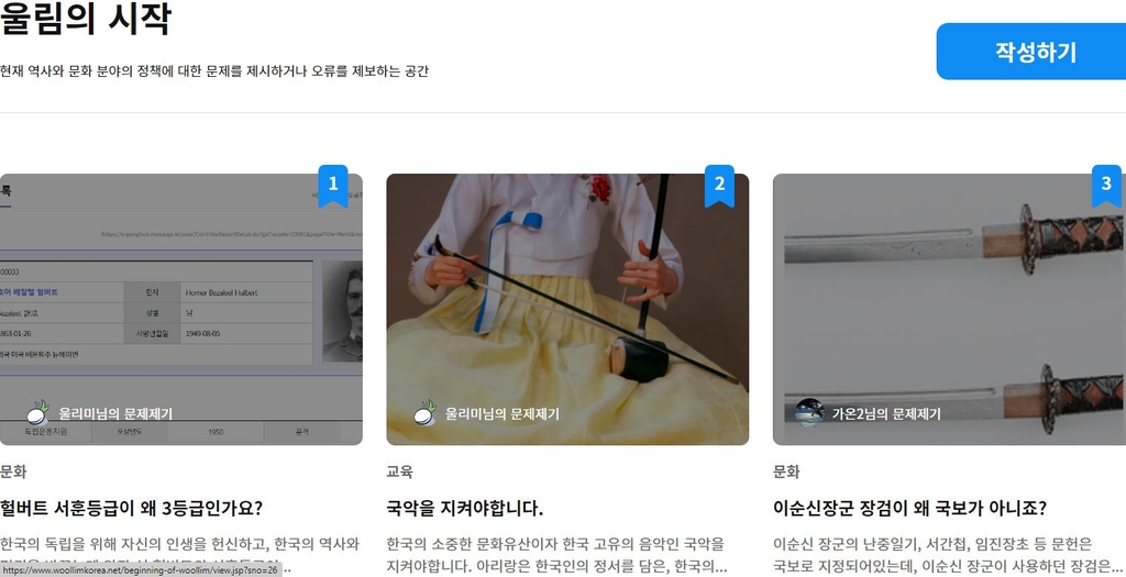 울림의 시작은 역사와 문화 분야의 정책에 대한 문제를 제시하거나 오류를 제보하는 공간이다. 현재 독립운동가 호머 헐버트(1863∼1949) 박사의 서훈 등급이 왜 3등급인지, 국악을 왜 지켜야 하는지, 이순신 장군 장검이 왜 국보가 아닌지 등의 문제 제기가 올라있다.
