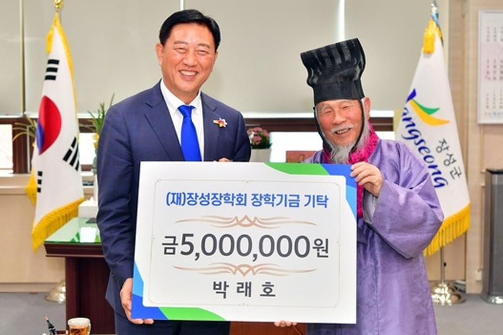 | ▲ 전남 장성군에 장학기금 기탁하는 노강 박래호 선생 [전남 장성군 제공. 재판매 및 DB 금지] |