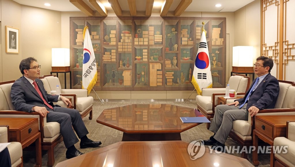 | ▲ 박보균 장관, 한기정 공정거래위원장과 면담 (서울=연합뉴스) 박보균 문화체육관광부 장관이 20일 서울 용산구 국립중앙박물관에서 한기정 공정거래위원장과 만나 콘텐츠 분야의 불공정 관행을 개선하기 위한 양 부처의 소통과 협업 강화 방안에 대해 면담하고 있다. 2023.7.20 [문화체육관광부 제공. 재판매 및 DB 금지] photo@yna.co.kr |