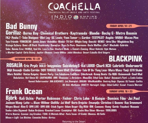 In an official announcement released Tuesday (U.S. time), Coachella Valley Music and Arts Festival unveiled its star-studded lineup for the annual event to be held at Empire Polo Club in Indio, California, featuring BLACKPINK, Bad Bunny and Frank Ocean as headliners.
