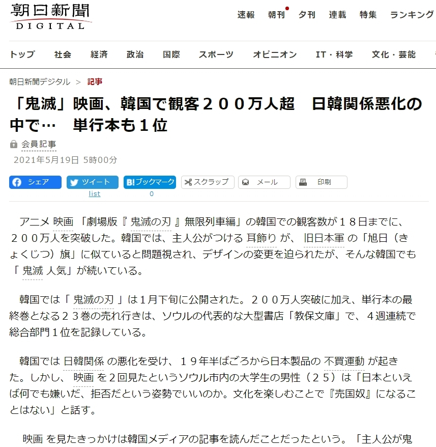신문은 한국에서는 한일관계 악화 속에서 2019년 중반부터 일본 제품 불매 운동이 일어났고, '귀멸의 칼날'을 둘러싸고는 주인공인 가마도 단지로(竈門炭治郎)의 귀걸이 디자인이 욱일기를 연상시킨다고 비난하는 목소리가 나왔다고 전제한 뒤 '귀멸의 칼날'을 2차례 봤다는 25세 남자 대학생 말을 소개했다.