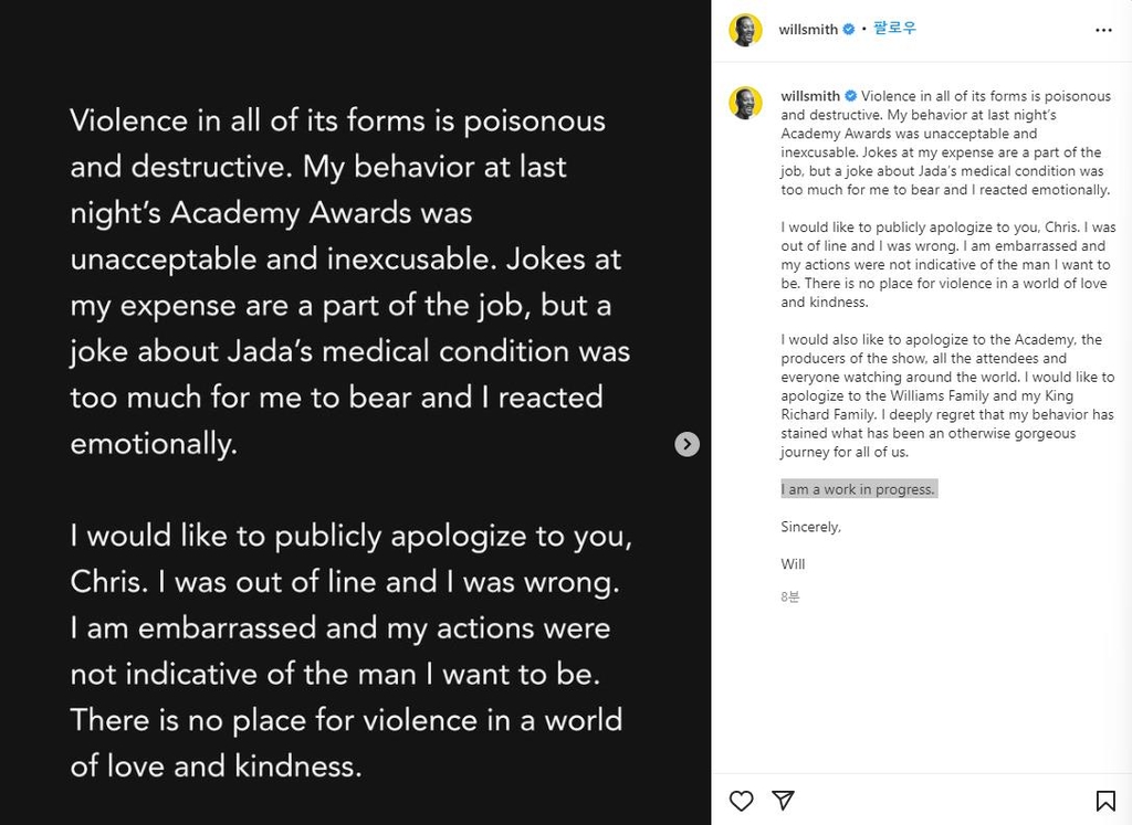 앞서 AMPAS는 시상식 종료 직후 SNS를 통해 "아카데미는 어떠한 형태의 폭력도 용납하지 않는다"는 짧은 입장만 발표했었다.