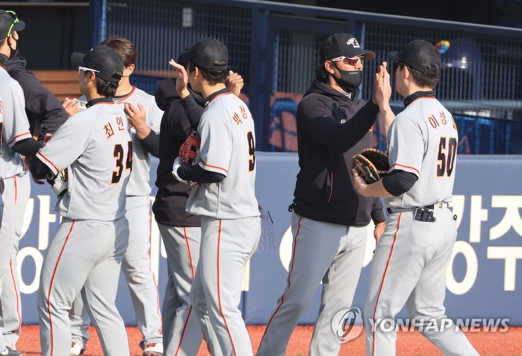 | ▲ Lee Sung-yul of the Hanwha Eagles (R) high-fives his manager Carlos Subero after their 4-3 victory over the Doosan Bears in a Korea Baseball Organization preseason game at Jamsil Baseball Stadium in Seoul on March 23, 2021. (Yonhap) |