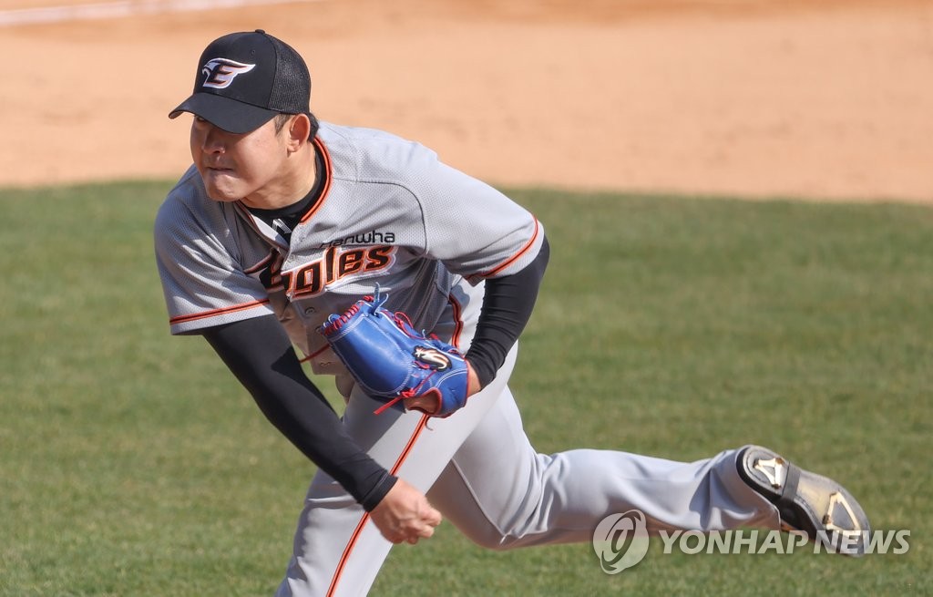 | ▲ Joo Hyun-sang of the Hanwha Eagles pitches against the Doosan Bears in the bottom of the eighth inning of a Korea Baseball Organization preseason game at Jamsil Baseball Stadium in Seoul on March 23, 2021. (Yonhap) |