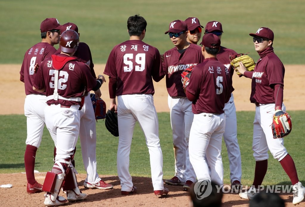 | ▲ Kiwoom Heroes' players celebrate their 3-1 victory over the Kia Tigers in a Korea Baseball Organization preseason game at Gwangju-Kia Champions Field in Gwangju, 330 kilometers south of Seoul, on March 28, 2021. (Yonhap) |