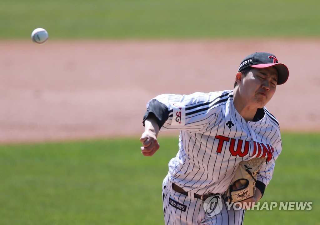 | ▲ Im Chan-kyu of the LG Twins pitches against the SSG Landers in the top of the second inning of a Korea Baseball Organization preseason game at Jamsil Baseball Stadium in Seoul on March 30, 2021. (Yonhap) |