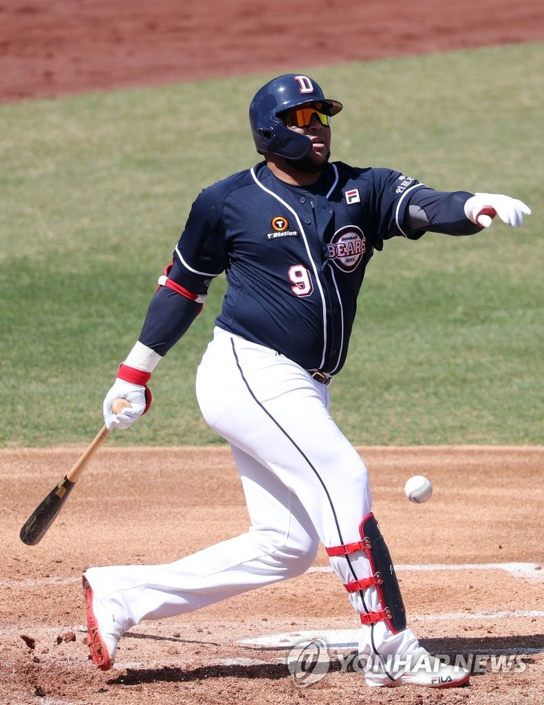 | ▲ Jose Miguel Fernandez of the Doosan Bears takes a swing against the Samsung Lions in the top fo the third inning of a Korea Baseball Organization preseason game at Daegu Samsung Lions Park in Daegu, 300 kilometers southeast of Seoul, on March 30, 2021. (Yonhap) |