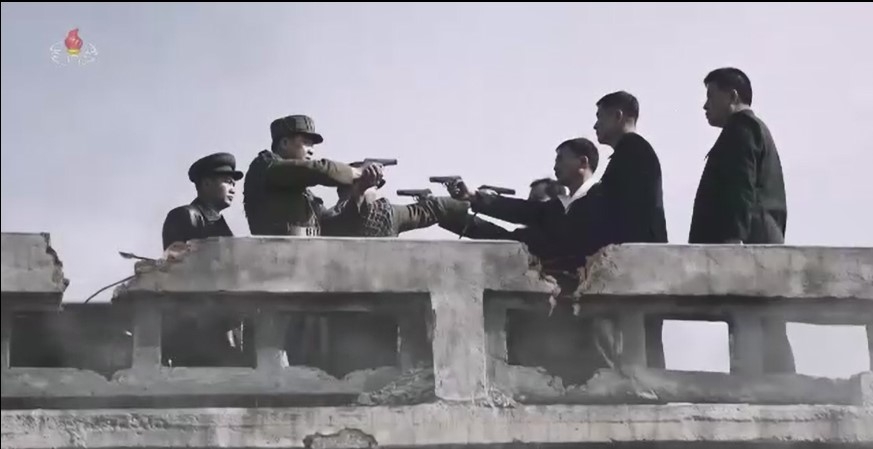 | ▲ '한 검찰일군의 수기' 2화에서 최형규 체포 과정 중 서로 총을 겨누는 검찰과 내각 [조선중앙TV 캡처. 재판매 및 DB 금지] |