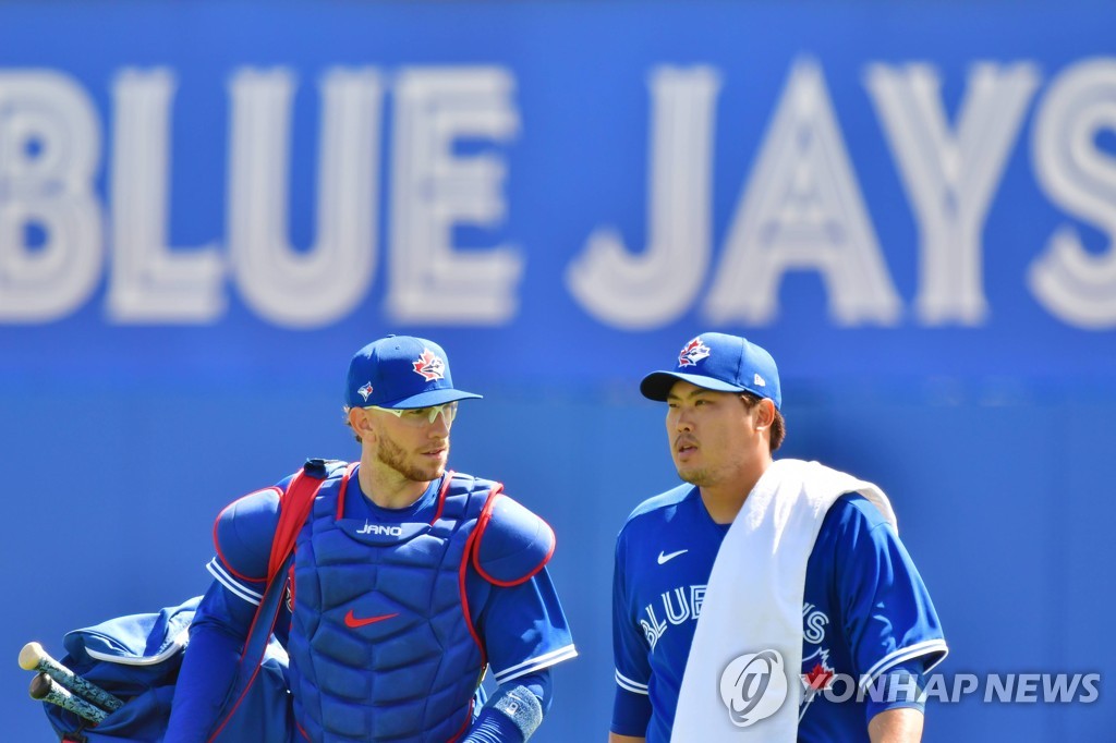 | ▲ In this Getty Images file photo from March 5, 2021, Toronto Blue Jays' pitcher Ryu Hyun-jin (R) and his catcher, Danny Jansen, walk out to the field at TD Ballpark in Dunedin, Florida, before a major league spring training game against the Baltimore Orioles. (Yonhap) |