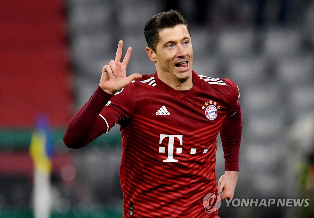 | ▲ '3골 넣었어요' 로베르트 레반도프스키(바이에른 뮌헨)가 9일 오전(한국시간) 열린 잘츠부르크(오스트리아)와의 2021-2022 유럽축구연맹(UEFA) 챔피언스리그 16강 2차전 홈 경기에서 전반 23분 만에 해트트릭을 완성한 뒤 손가락 세 개를 펴 보이고 있다. [로이터=연합뉴스] |