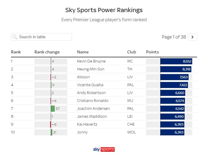 스카이스포츠 파워랭킹은 특정 기준에 따라 선수들의 점수를 매기는 개인 순위표다.