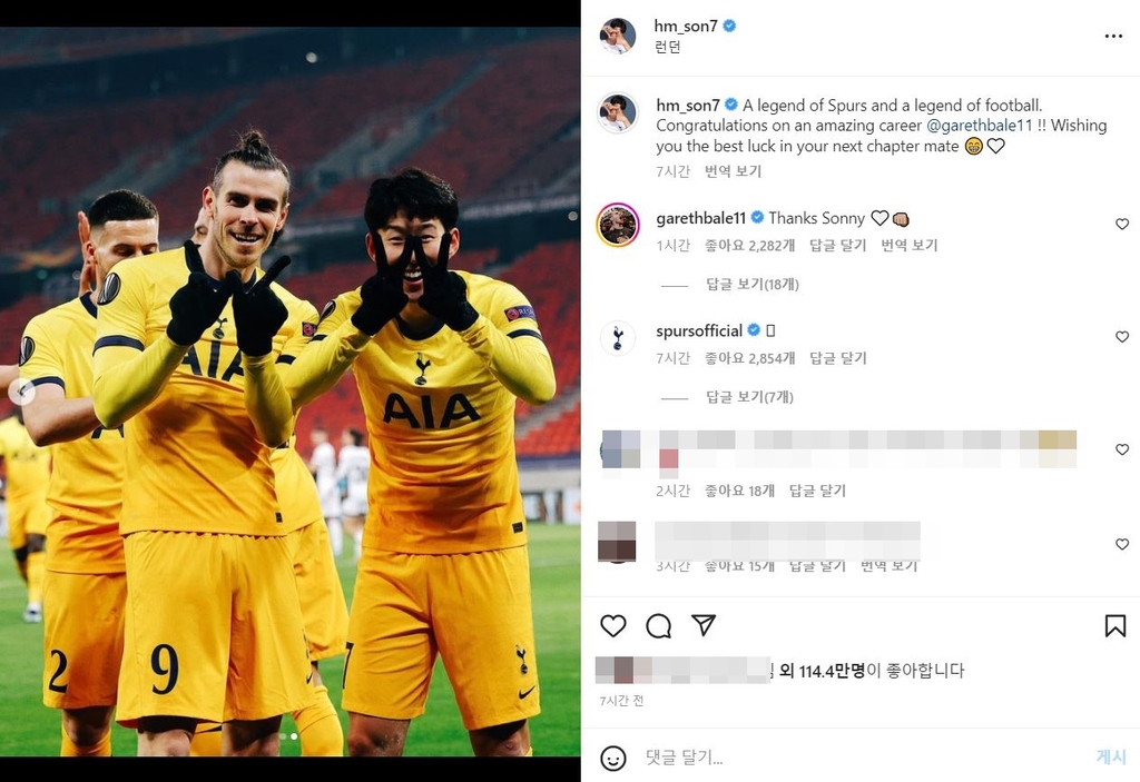 한편, 베일의 은퇴 소식에 토트넘에서 한솥밥을 먹은 손흥민(31)도 작별 인사를 건넸다.
