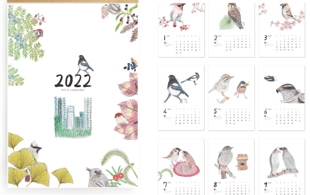 맹순씨는 거주지인 아파트 단지에서 1년간 기록한 새 47종 중 달별로 관찰할 수 있는 대표 새를 선정해 달력에 그렸다.