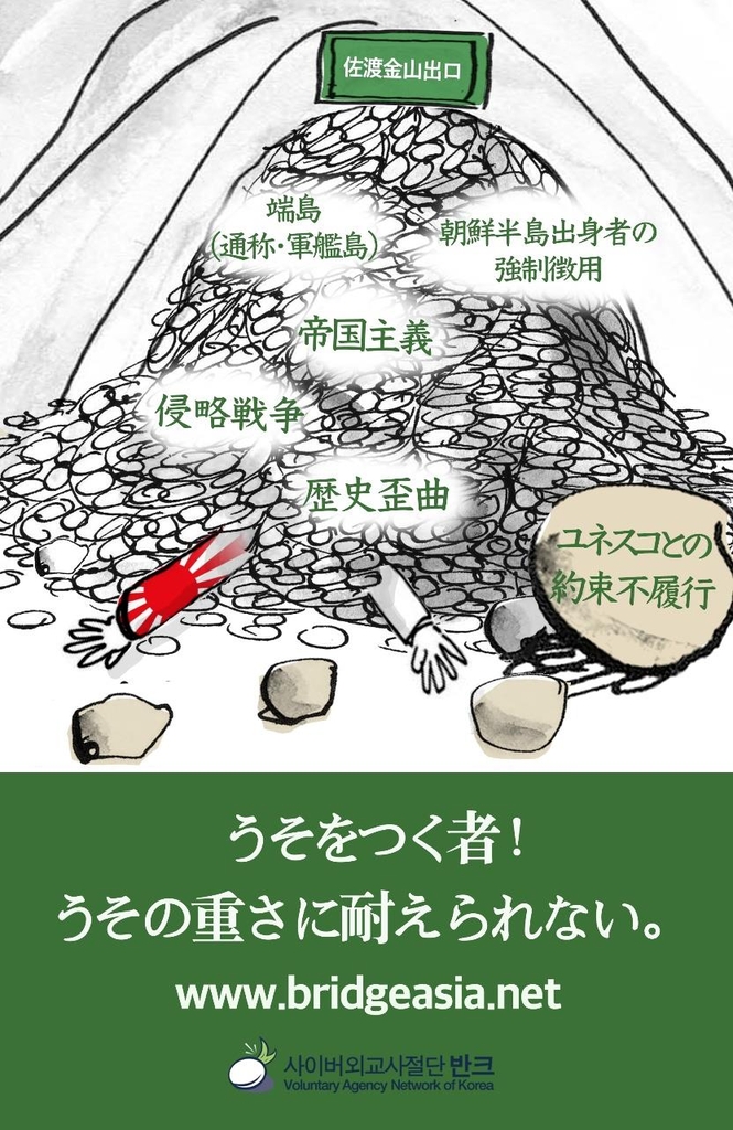(서울=연합뉴스) 왕길환 기자 = 일본 정부가 니가타(新潟)현의 '사도시마노킨잔'(佐渡島の金山·사도광산)을 유네스코 세계문화유산으로 등재하려는 데 대해 사이버 외교 사절단 반크는 "이를 막아달라"고 일본인들에게 호소하는 포스터를 제작해 10일 소셜미디어(SNS)에서 배포했다.