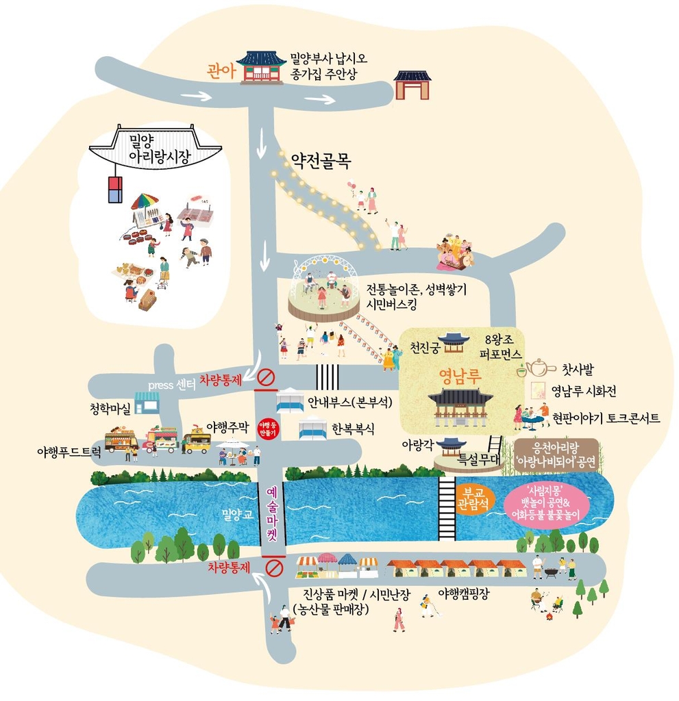 밀양교 위, 강변 둔치, 아리랑 전통시장에는 지역 예술가들이 만든 공예품을 파는 야시장, 시민 장터가 선다.