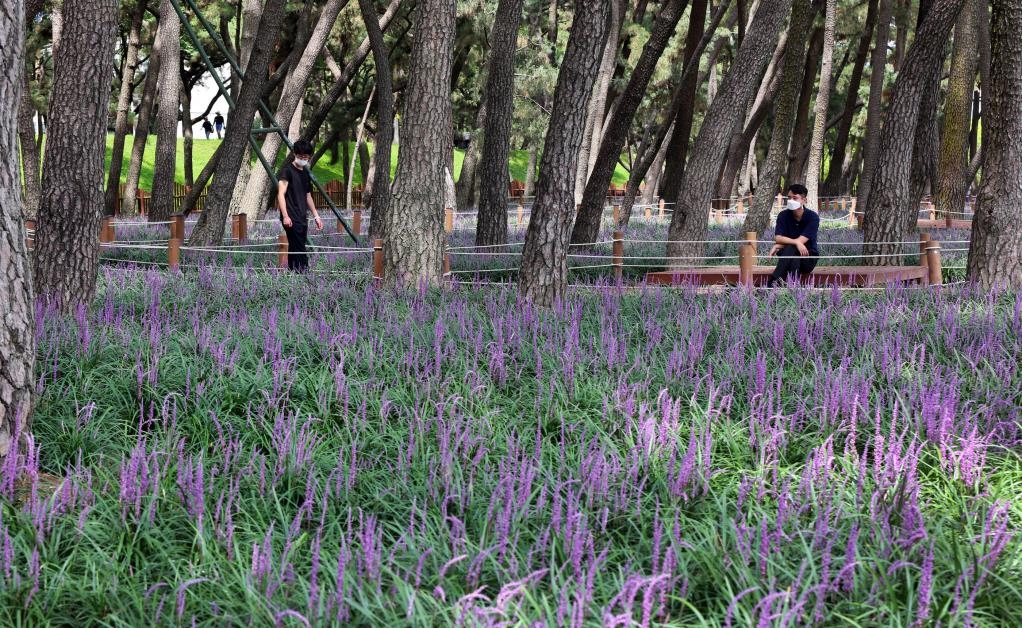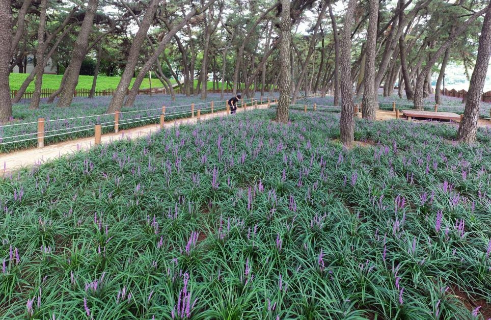 그늘에서도 잘 자라는 맥문동은 1년 만에 꽃을 활짝 피워 소나무 숲을 찾는 시민들에게 색다른 정취를 선사한다.