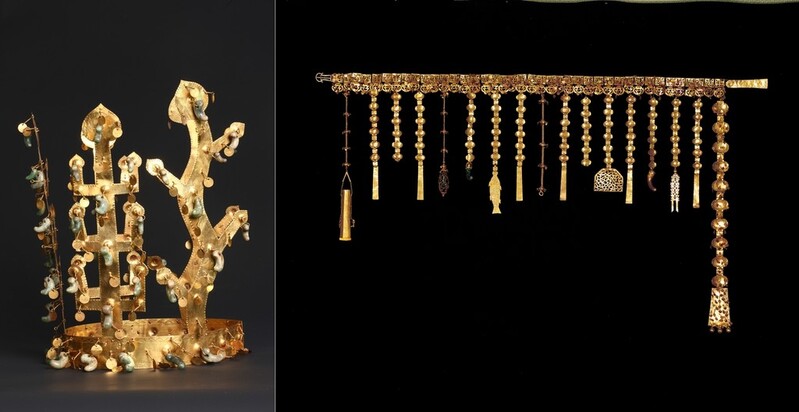 | ▲ 국보 금관총 금관(왼쪽)과 금제 허리띠(오른쪽) [국가유산청 국가유산포털 제공. 재판매 및 DB 금지] |