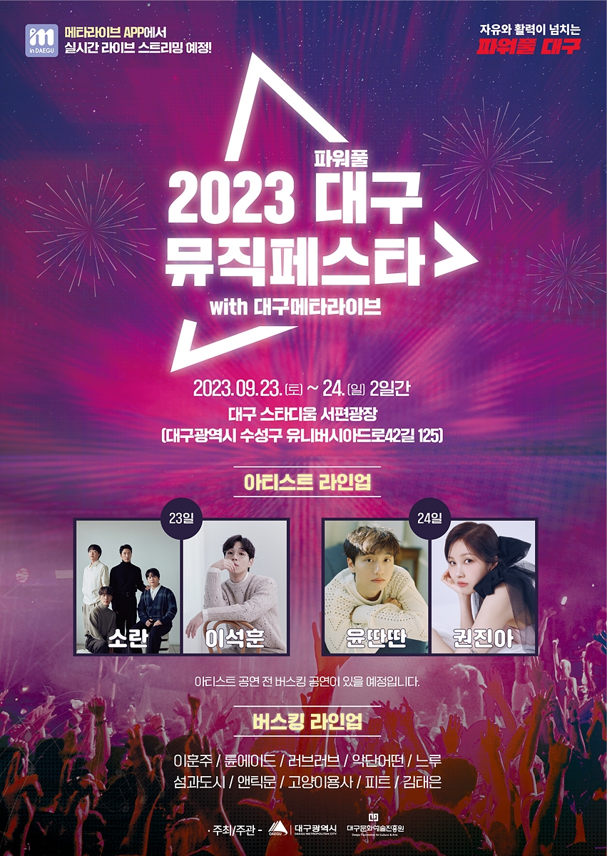 (대구=연합뉴스) 이덕기 기자 = 대구시는 오는 23∼24일 '2023파워풀대구 뮤직페스타' 콘서트를 온라인과 오프라인에서 동시에 개최한다고 3일 밝혔다.