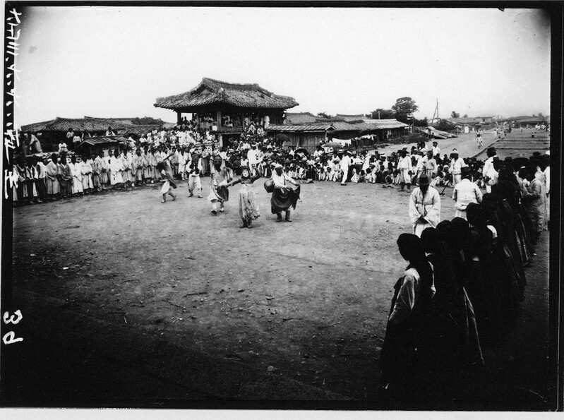 | ▲ 관덕정 마당에서 펼쳐진 입춘굿놀이 (제주=연합뉴스) 1914년 6월 관덕정 앞마당에서 펼쳐진 입춘굿놀이 모습. 2023.11.26 [국립중앙박물관 제공, 재판매 및 DB 금지] |