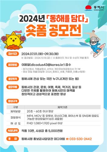 임정규 홍보감사담당관은 "이번 숏폼 공모전을 통해 동해시의 아름답고 감성적인 장면들이 다양한 방식으로 담기기를 기대한다"고 말했다.