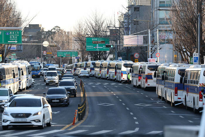 Barricades of police buses are seen near the Constitutional Court in Seoul on Feb. 6, 2025, as detained President Yoon Suk Yeol is set to attend the sixth hearing of his impeachment trial in connection with his short-lived imposition of martial law in December. (Yonhap)