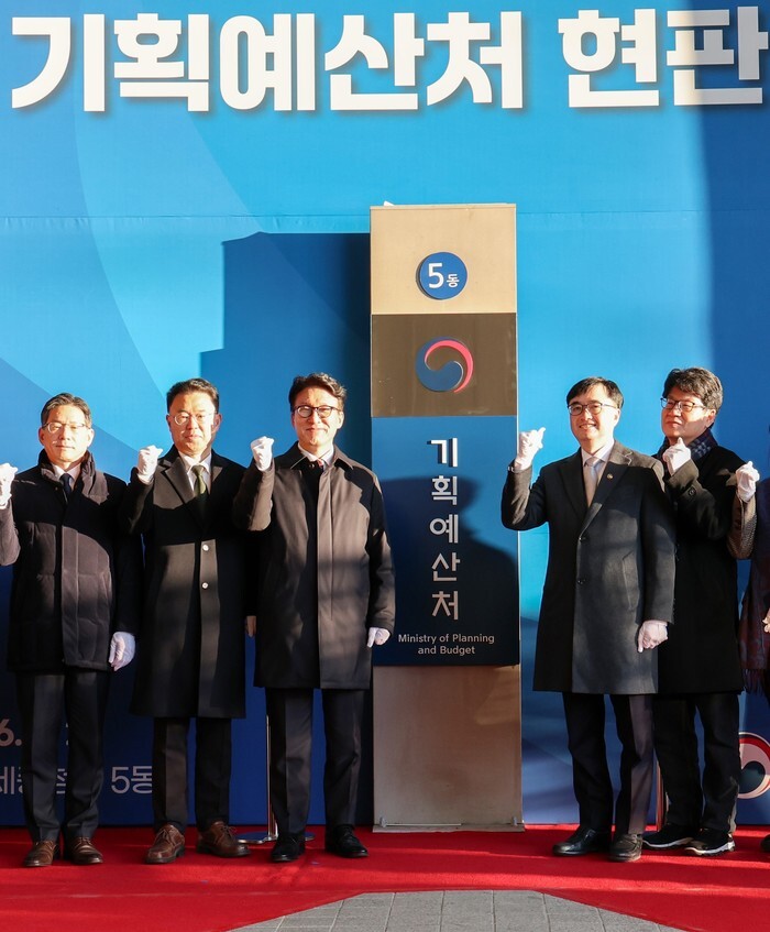 Prime Minister Kim Min-seok (3rd from L) and others take part in a ceremony at the government complex in Sejong, central South Korea, on Jan. 2, 2026, to unveil a plaque displaying the Korean and English name of the Ministry of Planning and Budget, installed under the prime minister's office as part of a government reorganization bill. (Yonhap)