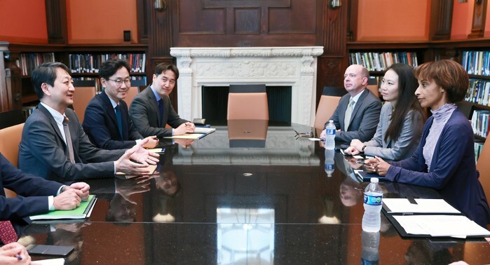 South Korea's Industry and Trade Minister Ahn Duk-geun (L) meets with Cecilia Rouse (R), head of the Brookings Institution, in Washington on June 24, 2024, in this photo provided by the ministry. (PHOTO NOT FOR SALE) (Yonhap)