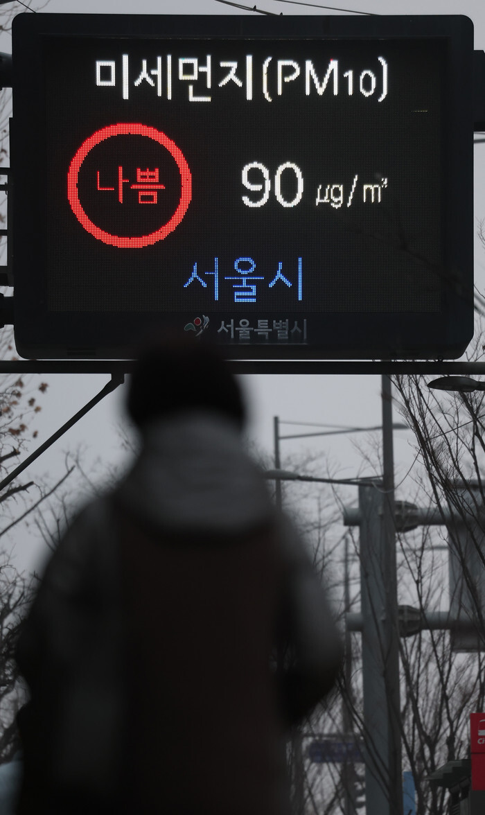 An electronic signboard near City Hall in Seoul shows the atmospheric level of PM10, harmful particles that are smaller than 10 microns in diameter, is forecast to remain "bad," with 90 micrograms per cubic meter, on Jan. 16, 2026. (Yonhap)